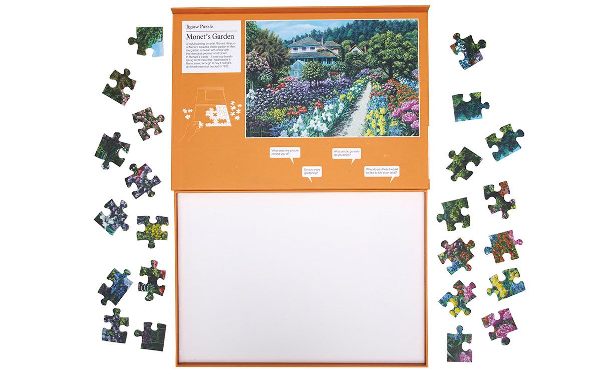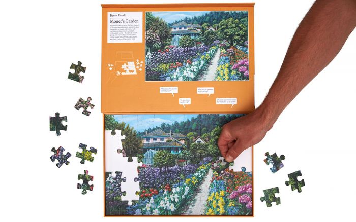 Jardim de Monet é um puzzle com 63 peças que retrata uma imagem primaveril, do artista Richard Harpum, perfeita para iniciar conversas com todas as pessoas que amam arte e  natureza.